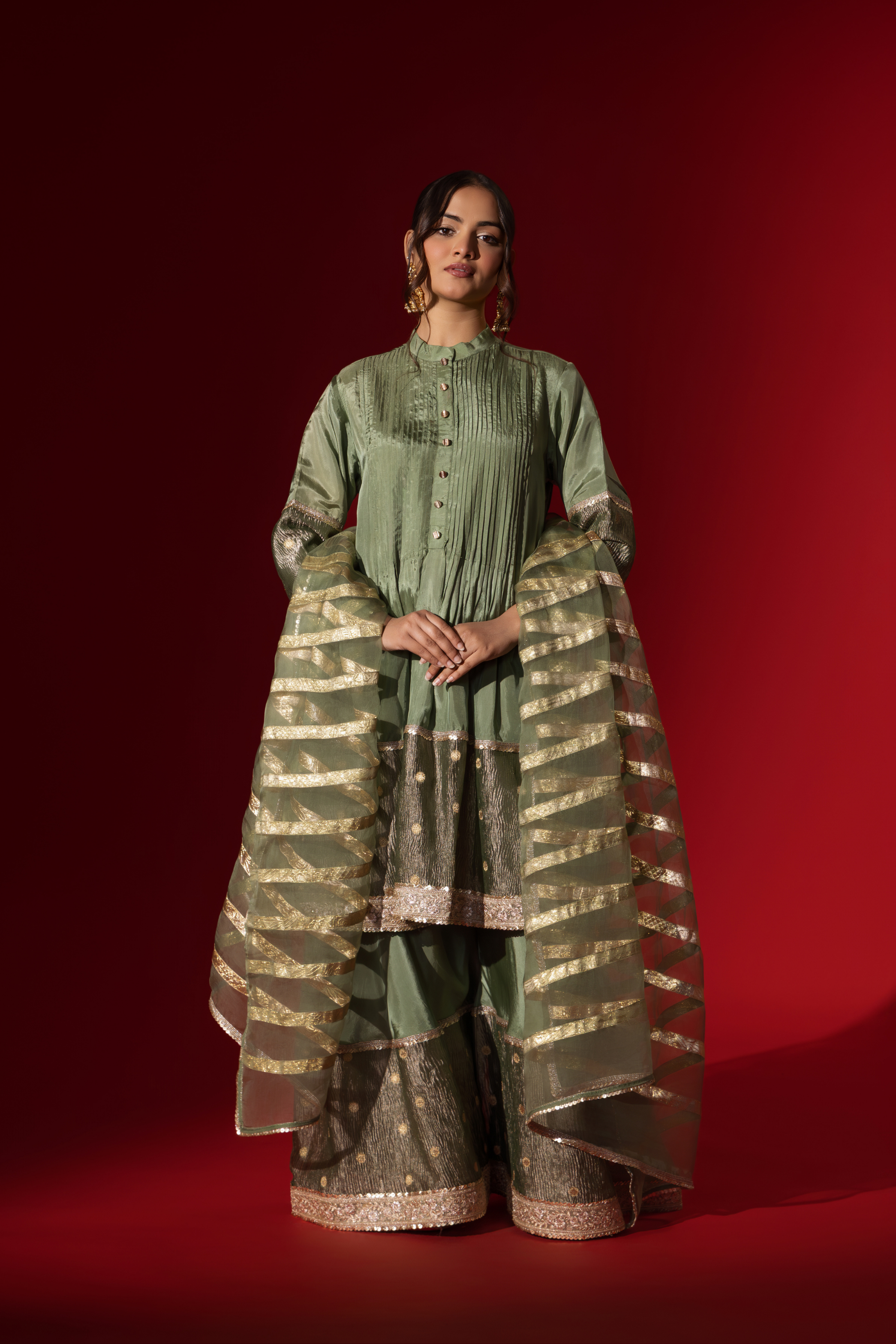 The captivating deep green kurta serves as a rich canvas, highlighted by an elegant mandarin collar and the signature vertical pleating which adds a magnificent textural element to the upper body. The set's drama is amplified by the accompanying voluminous Sharara pants, which guarantee fluid, celebratory movement, and the stunning sheer organza dupatta with bold gold metallic stripes.