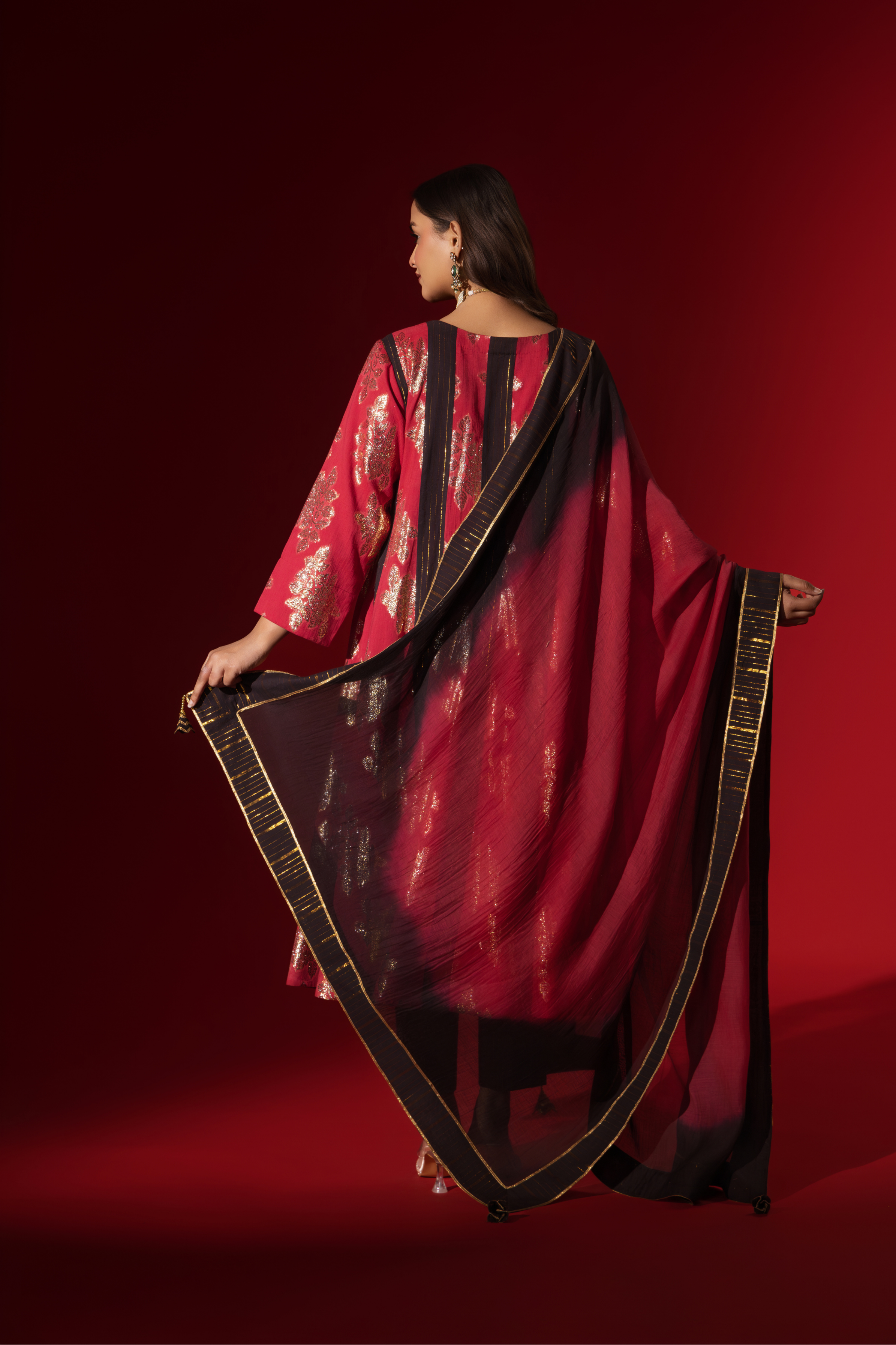 Crafted in premium cotton lurex fabric, the captivating color combination of Red and Black is instantly dramatic, enhanced by the kurta's gracefully flared Anarkali silhouette. The distinguishing feature is the round-neck yoke, designed with striking Black and Gold vertical striping, framing the neck beautifully. Paired with matching pants for a contemporary finish and a dual tone dupatta, the set is is a perfect blend of traditional flair and modern style.