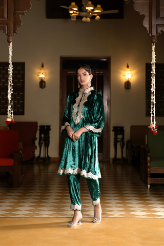 Pair your velvet co-ord set with statement jhumkas or a light Kashmere shawl for an effortless festive look. For a more refined vibe, add minimal gold jewelry and ankle boots - a perfect mix of comfort and sophistication.