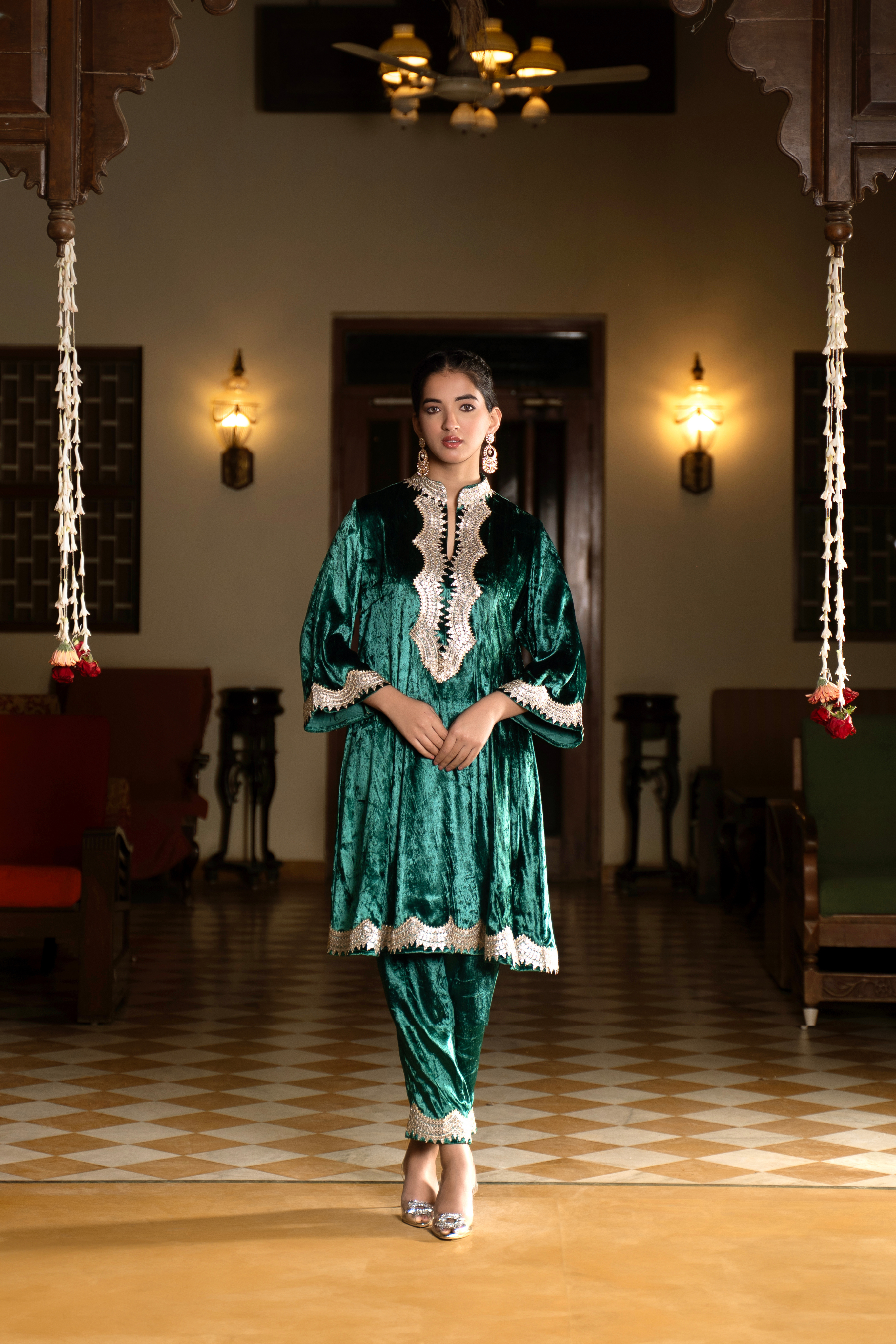 The Naseebo Bottle Green Royale Velvet Co-ord Set is a breathtaking ensemble designed to deliver maximum drama and feminine grace.