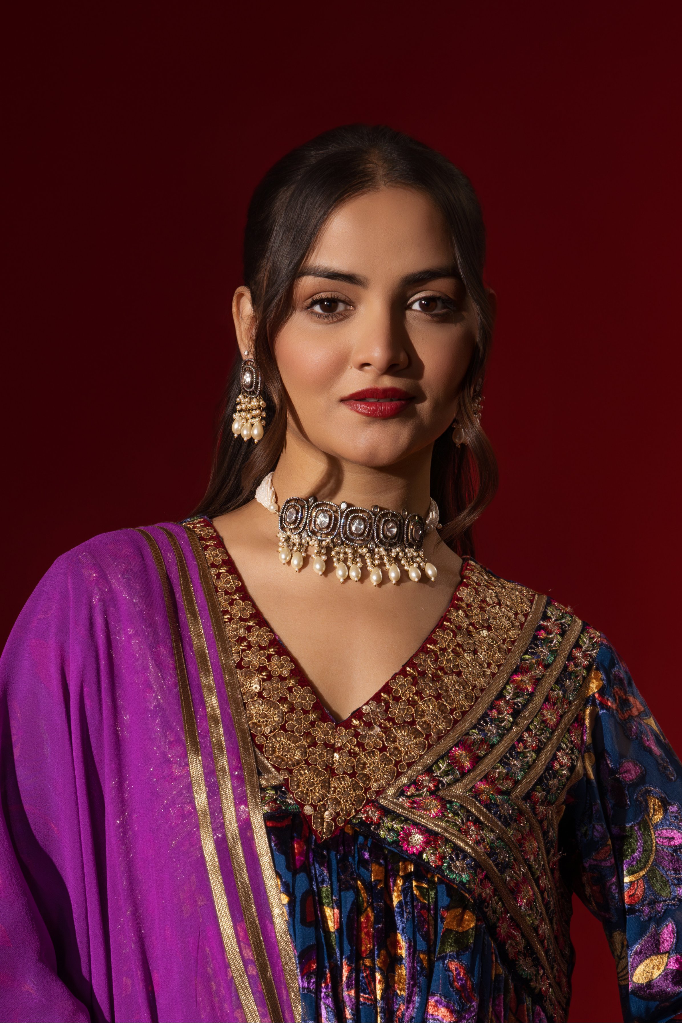 This three-piece ensemble is crafted from luxurious velvet fabric in a captivating deep violdet hue. The kurta features an intricate multi-color floral print that shimmers with quiet grandeur, reflecting light in a rich, warm cascade. The anarkali silhouette along with rich hand-embroidery and gota work make the kurta a statement piece. Paired with matching pants and a bright purple dupatta, this is the ideal choice for winter wedding festivities.