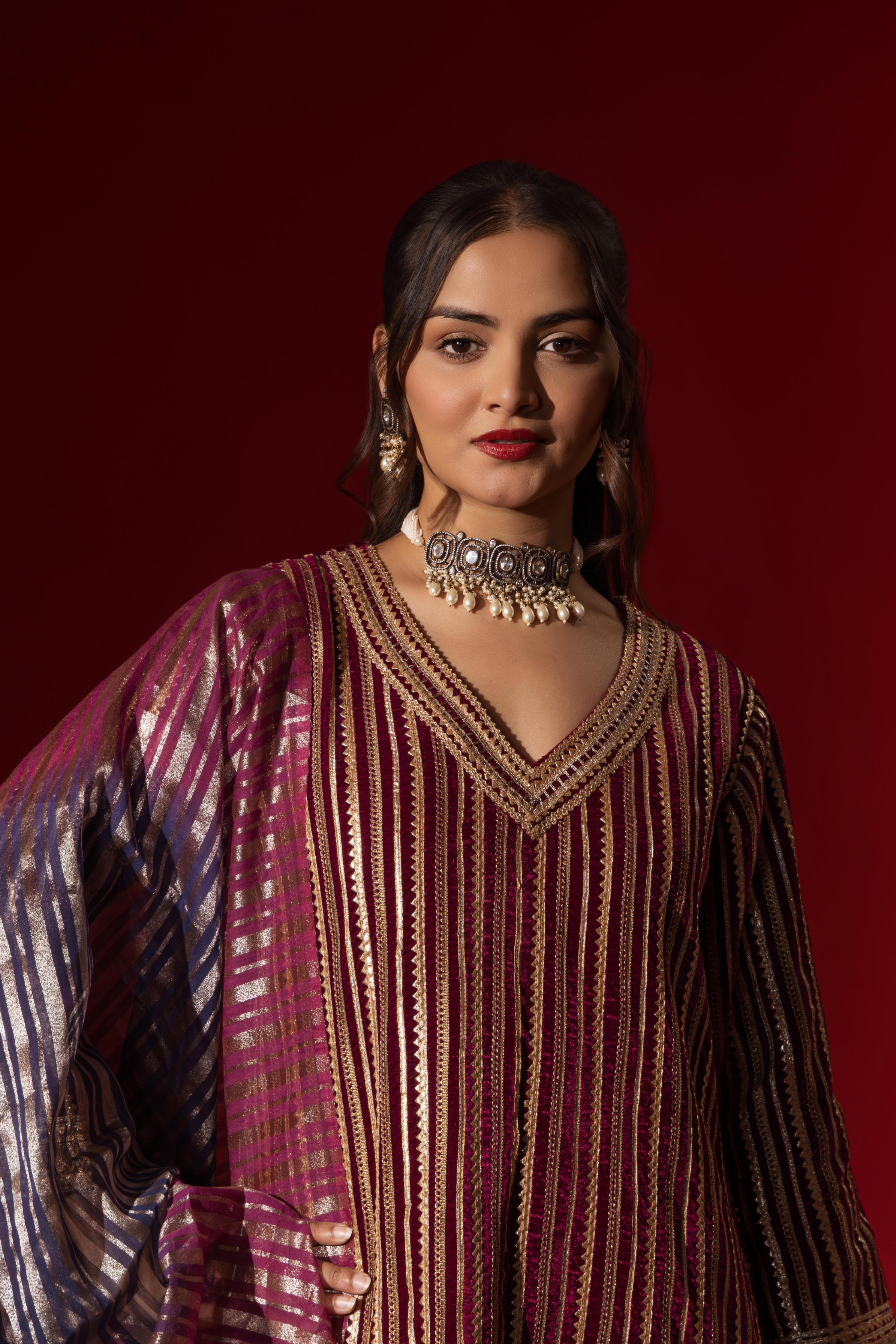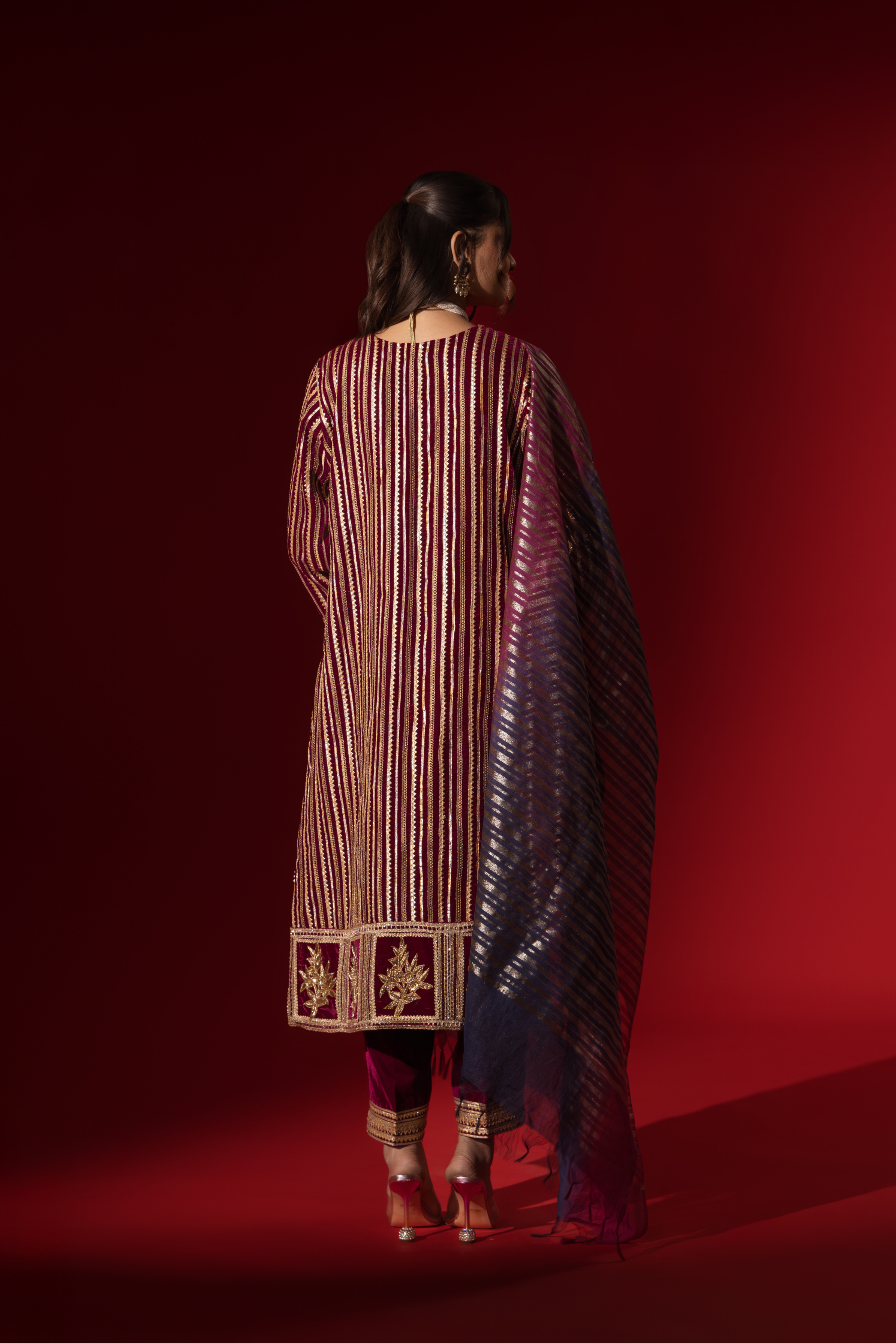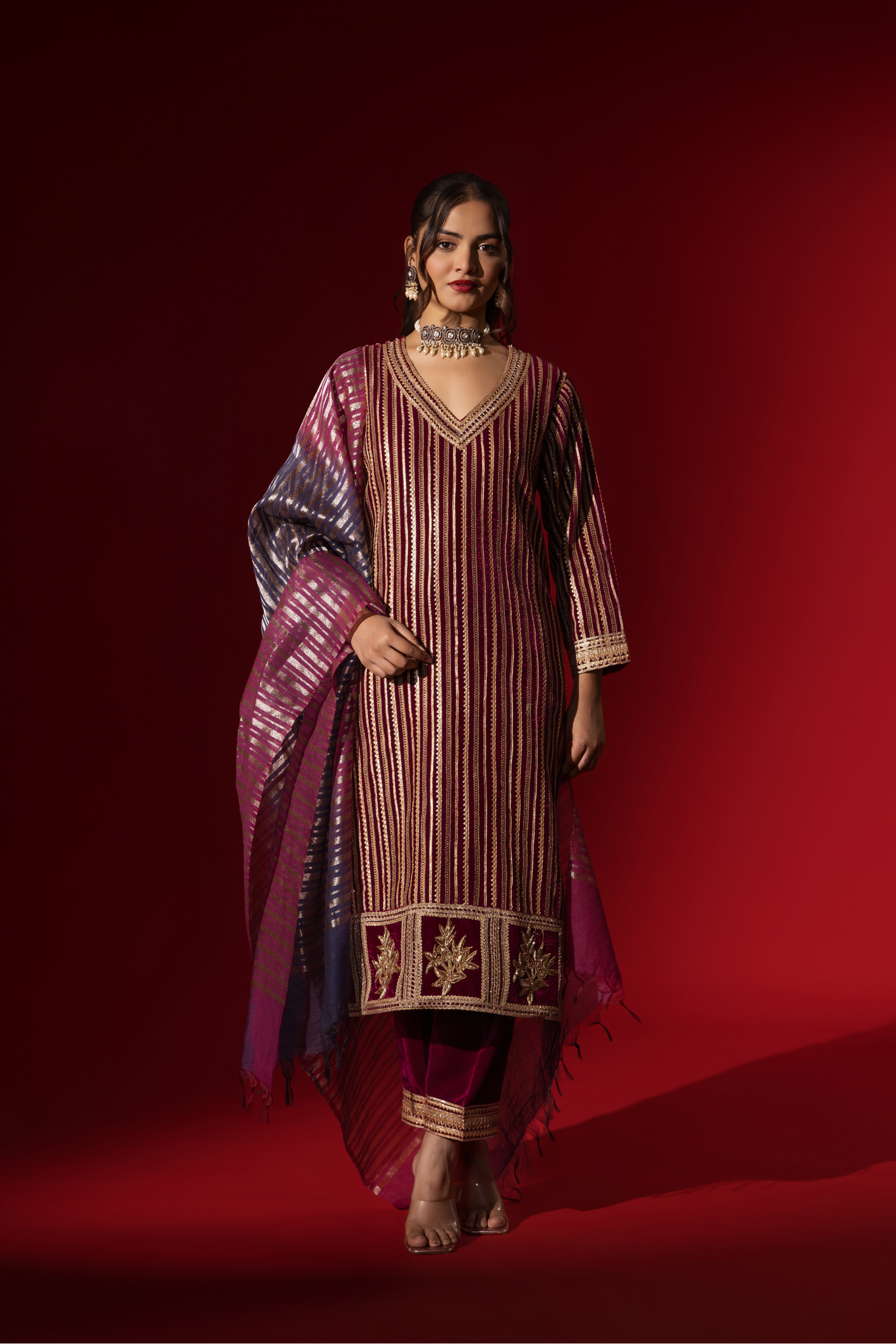Embrace the richness of tradition with the Naseebo Wine Velvet Gota Kurta Set, a three-piece ensemble crafted from high-quality velvet.