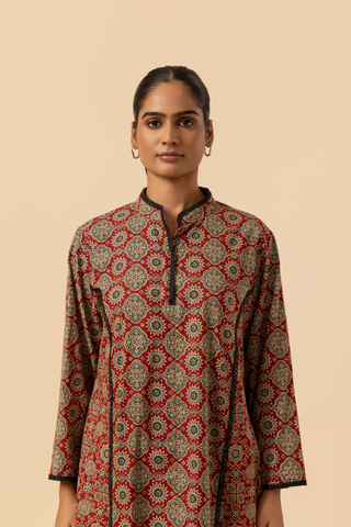 Ajrakh printing is a centuries-old craft known for its intricate patterns and deep, earthy tones. The Ajrakh material used in the Terra Collection is carefully crafted using natural dyes and traditional block-printing techniques. From modal silk Ajrakh fabric to Ajrakh cotton fabric, our designs bring a touch of heritage to modern wardrobes. The modal Ajrakh fabric gives a rich texture and a luxurious feel, making it perfect for both casual and formal wear.