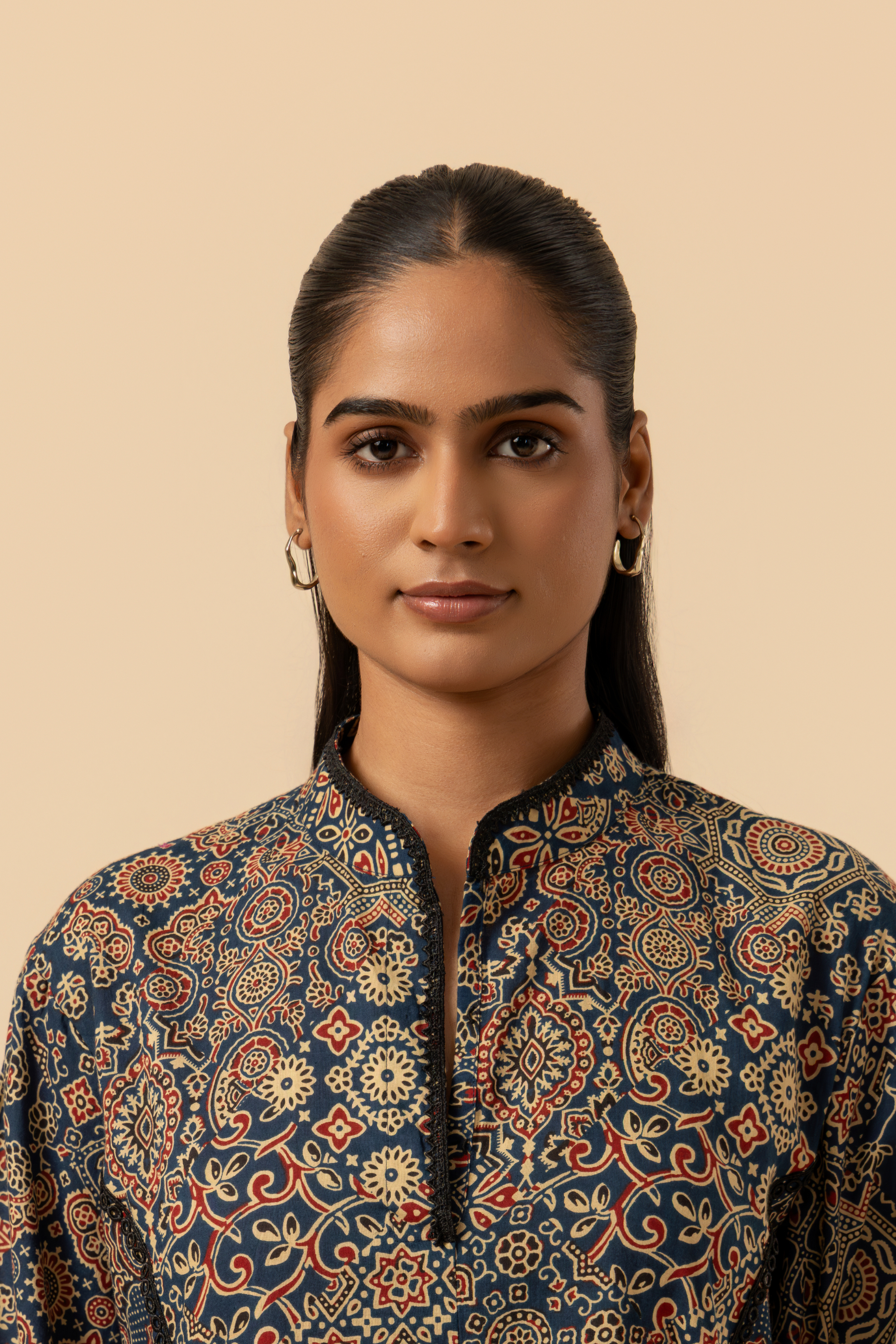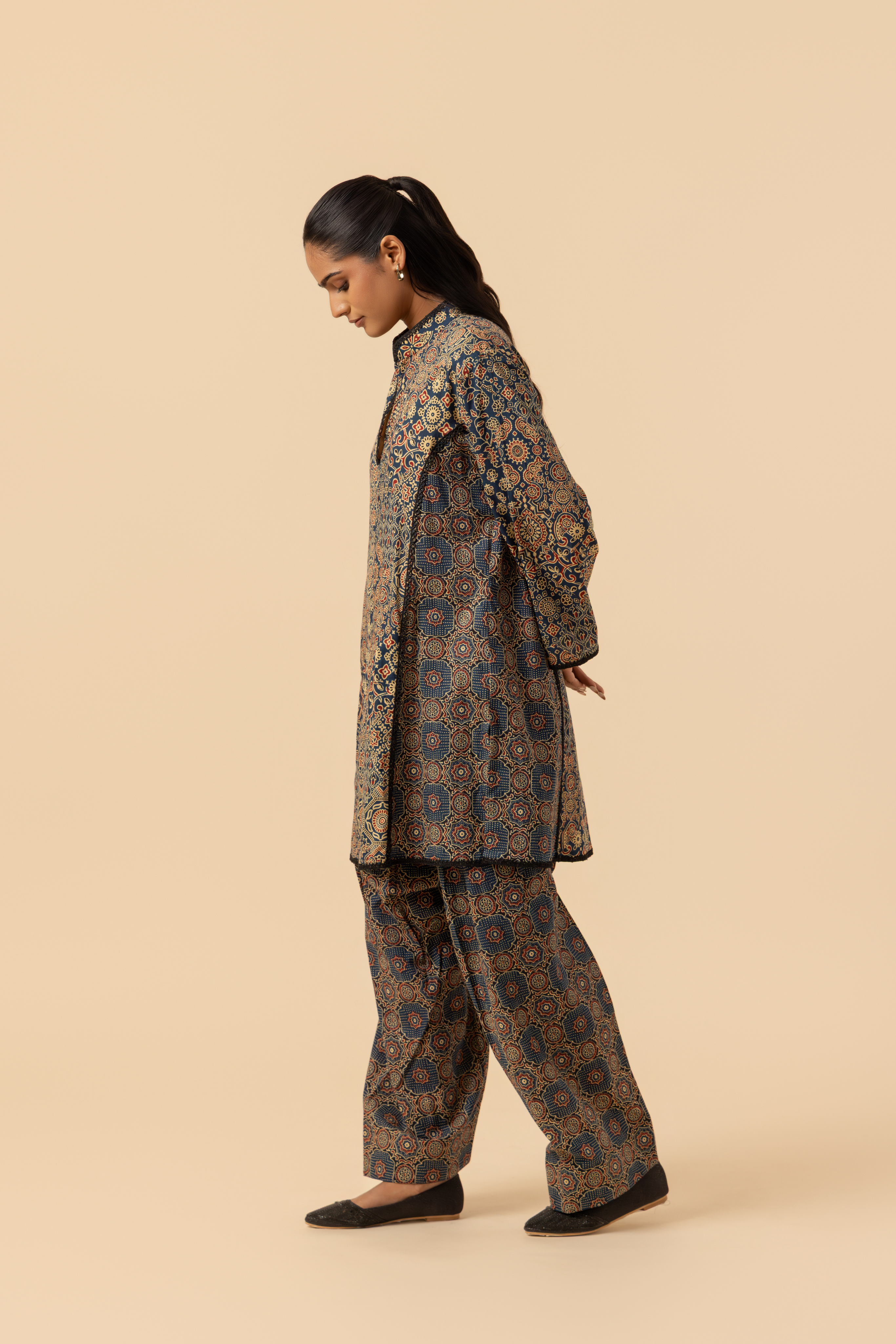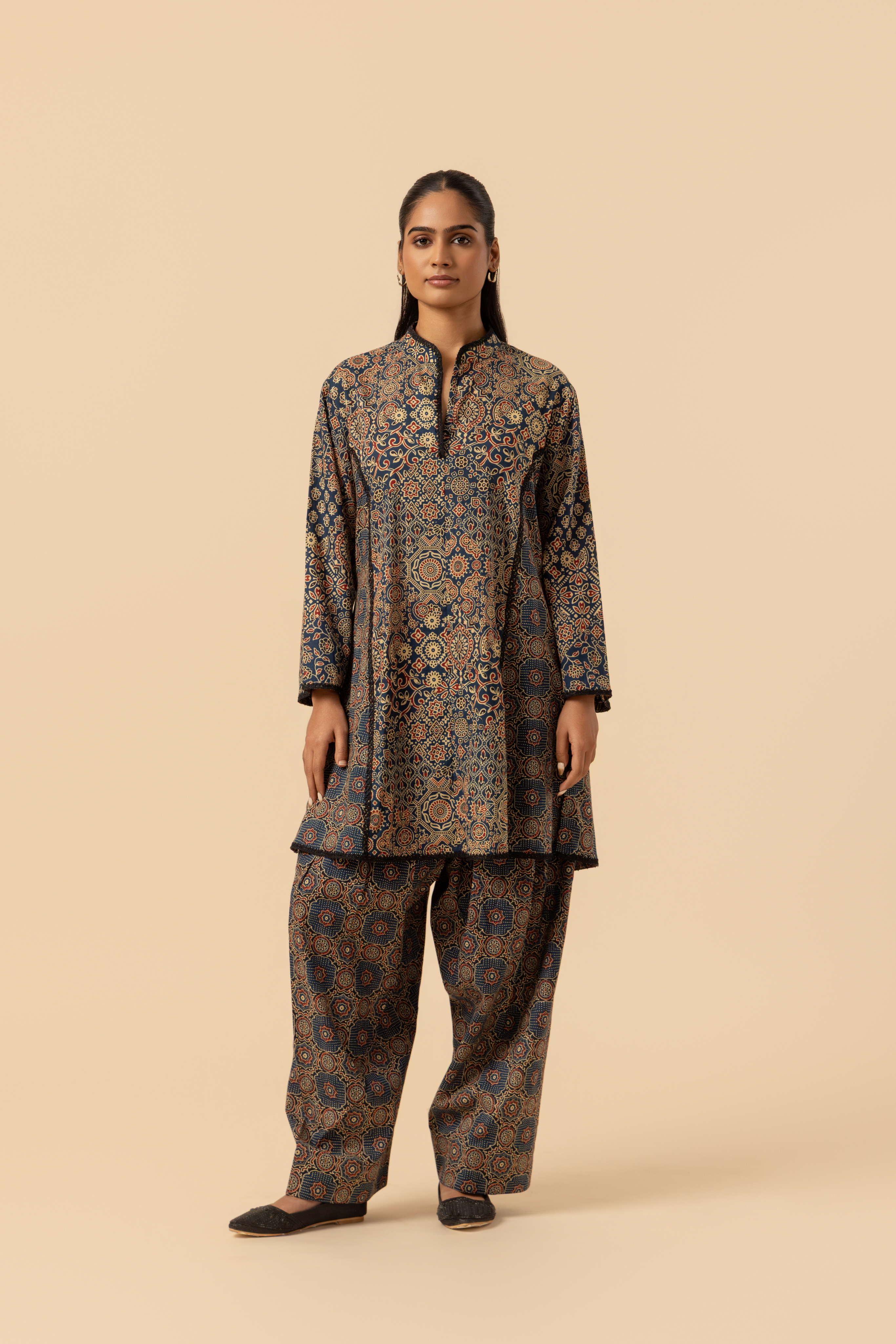 The straight kurta features authentic Ajrakh motifs, a classic stand collared neckline, and full sleeves. Complementing it is a flowing farshi salwar, designed for roomy comfort and rooted in traditional Indian silhouettes.