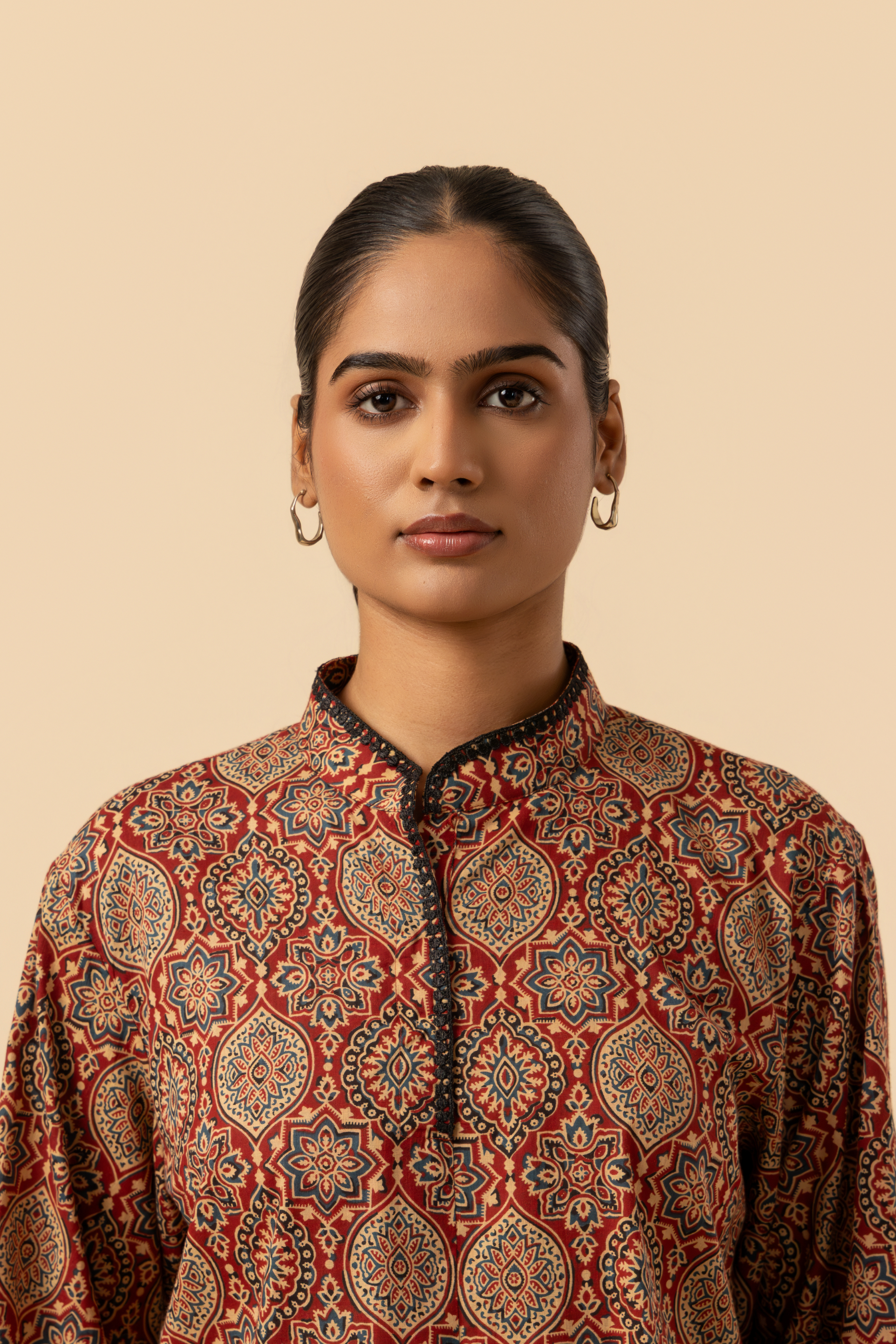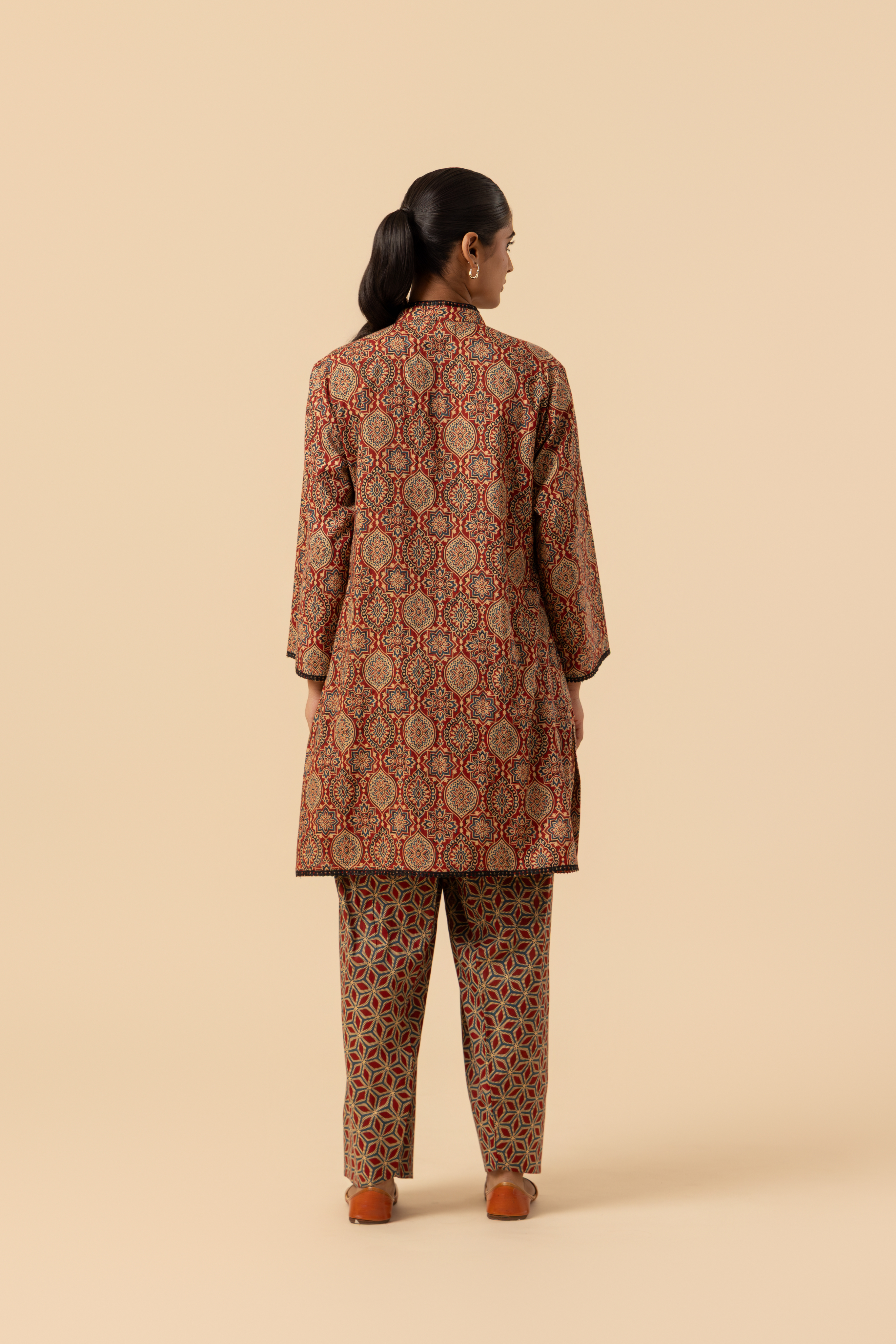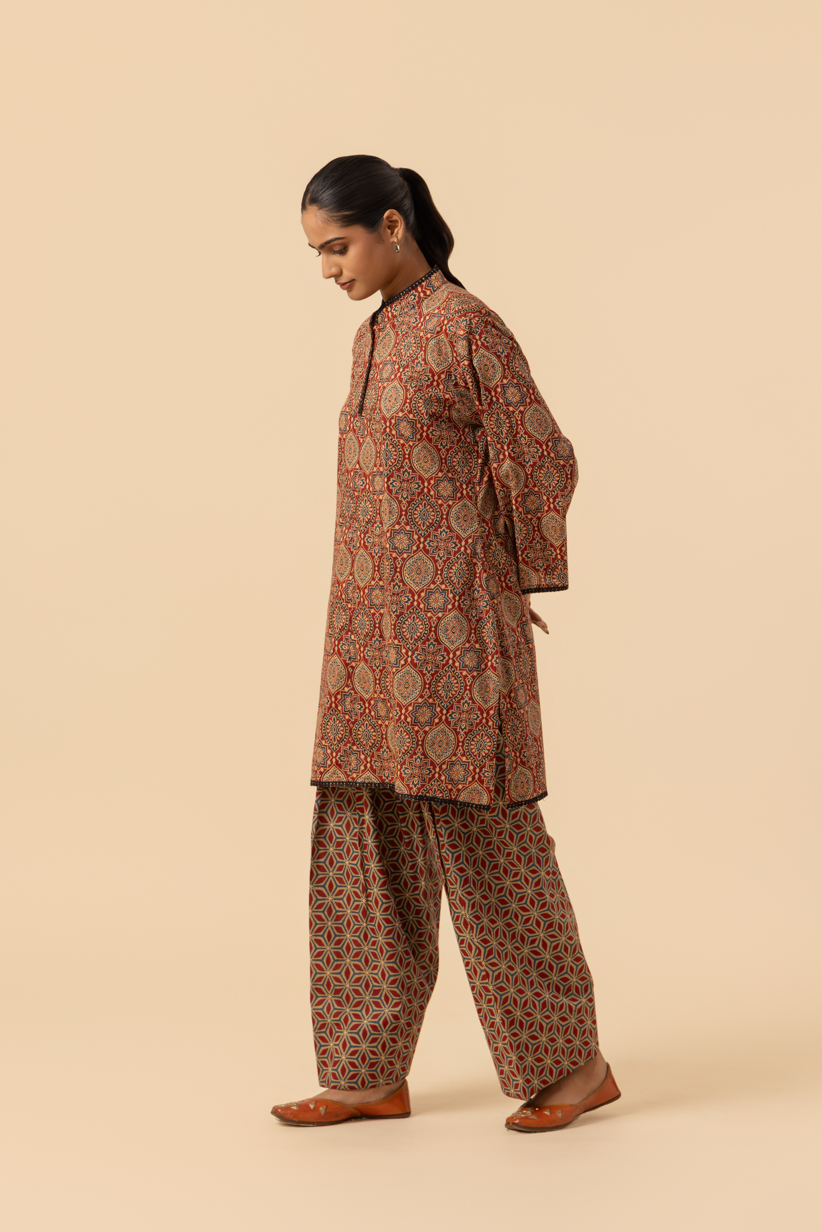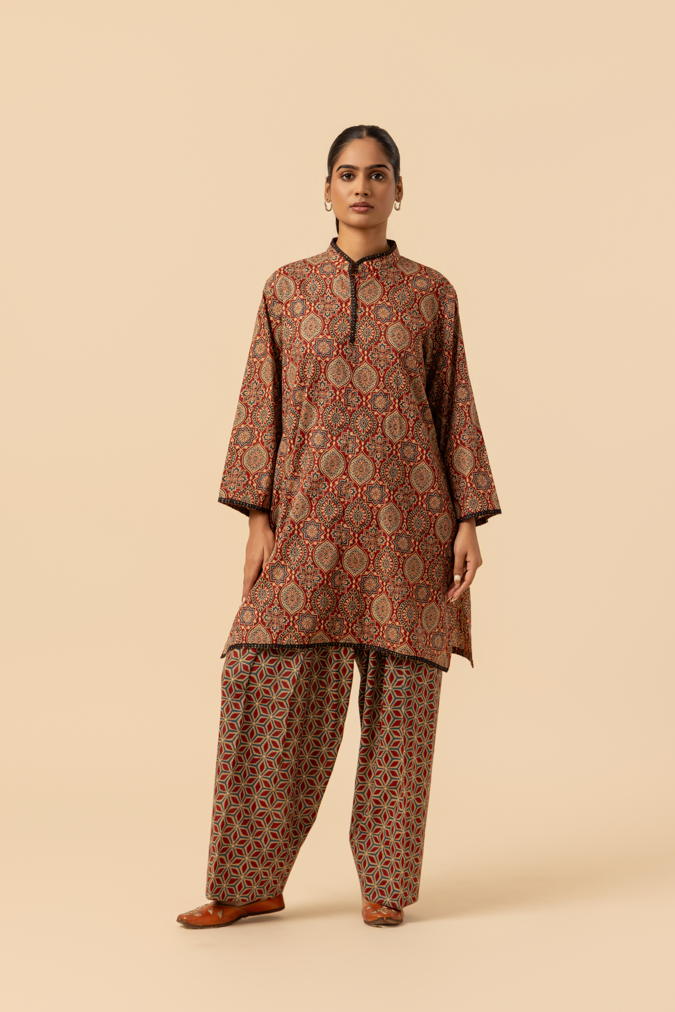 Fashioned from soft, luxurious organic cotton, this hand-block printed set features a dense, repeating Ajrakh motif in deep red, black, and forest hues. The straight-fit short kurta is defined by its elegant band collar and clean hemline, offering a refined look, along with full sleeves. Paired with this are the traditional Farshi Salwar bottoms, designed with a semi-elasticated waist to provide ultimate comfort and a graceful flare.