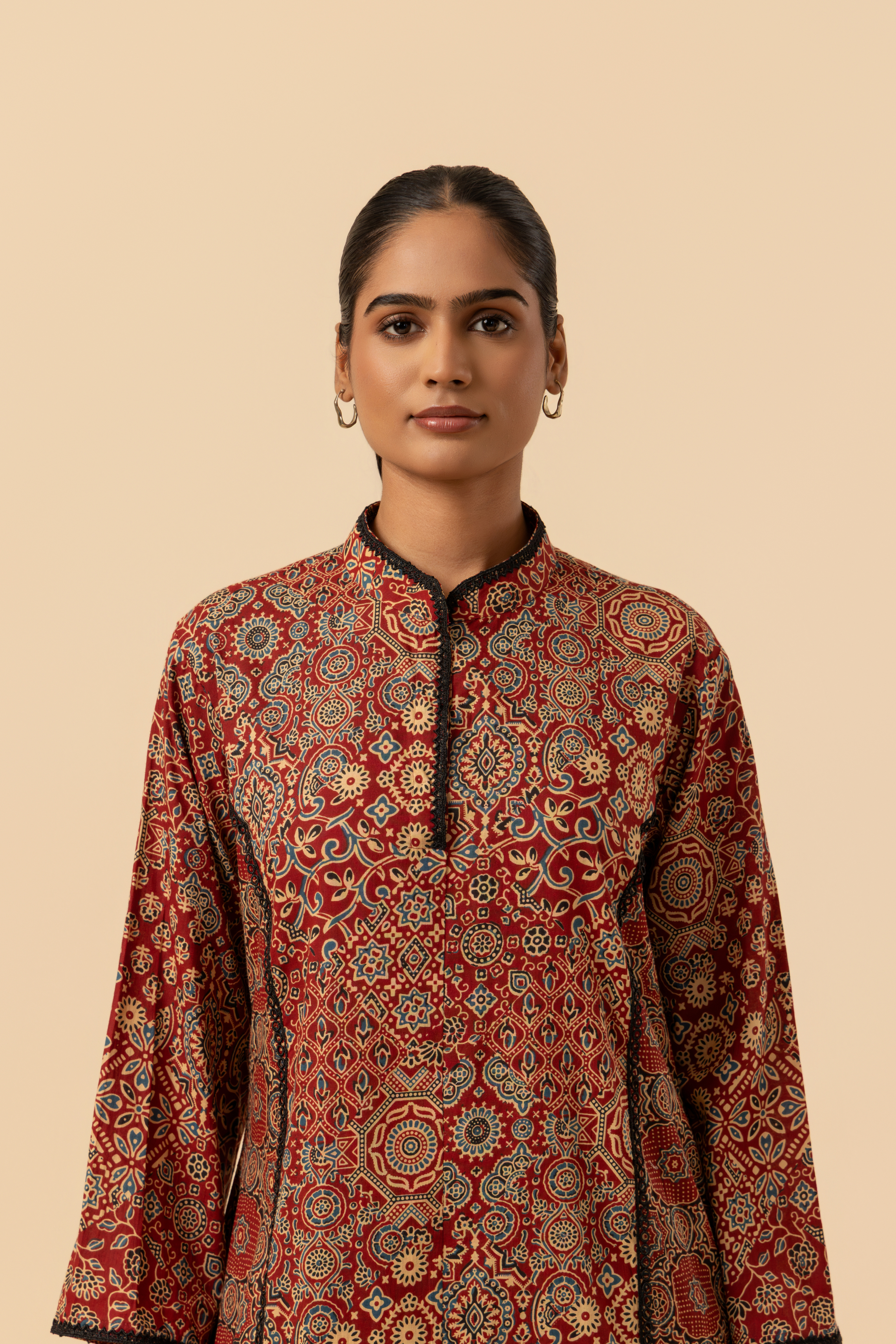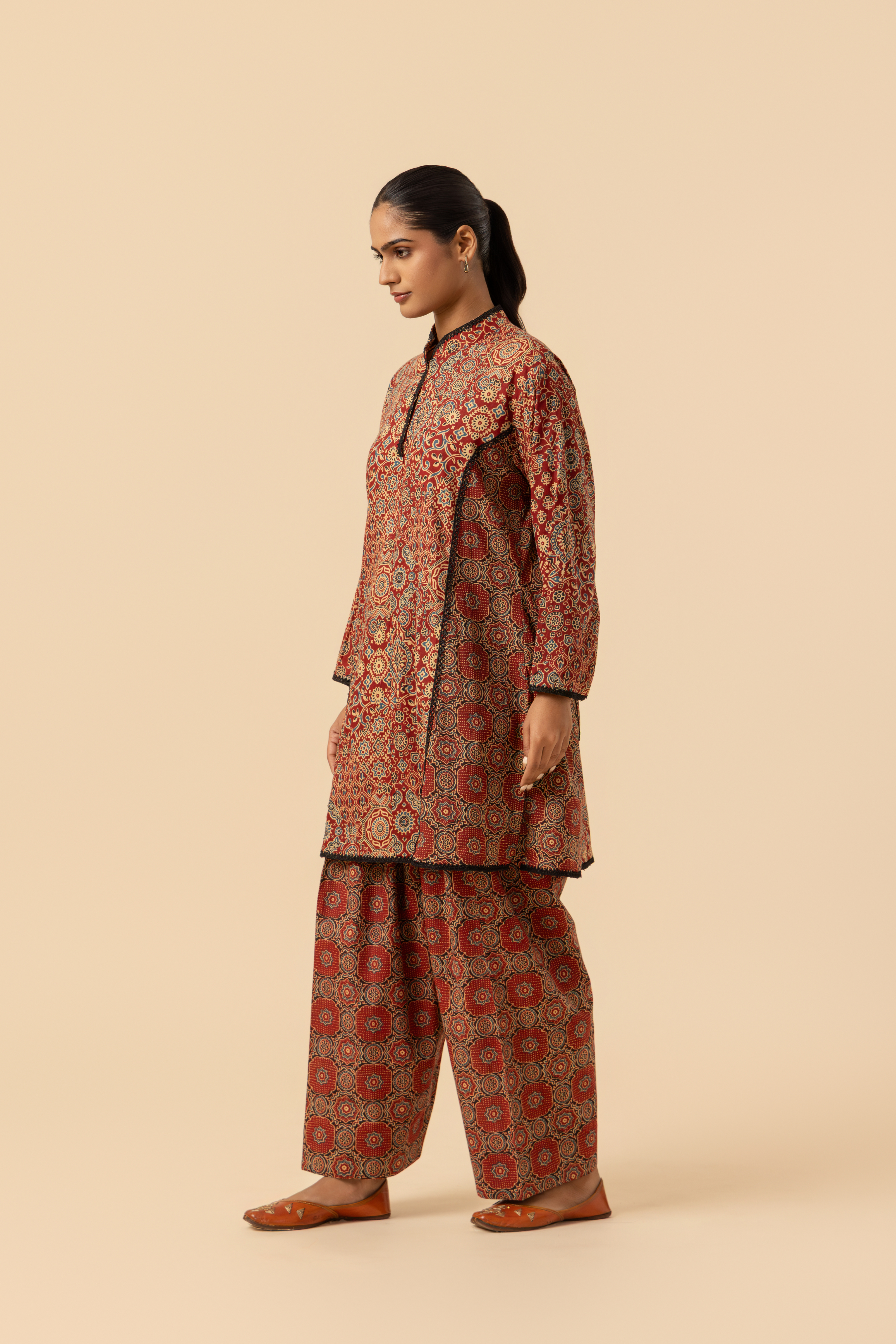 Ideal for festive wear, cultural events, or upscale daily attire, this sustainable fashion piece seamlessly blends traditional Ajrakh craft with a contemporary edge.