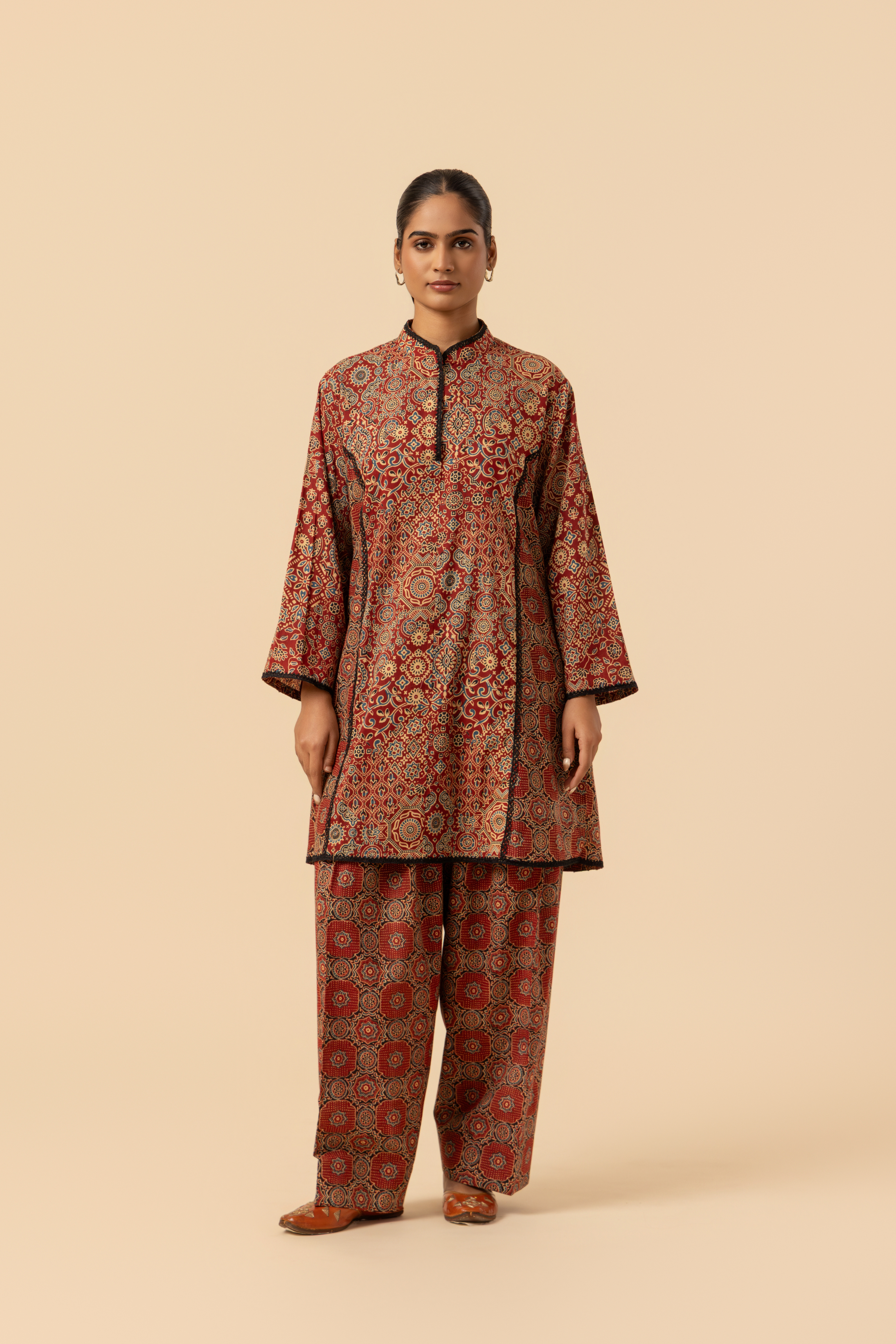 Discover effortless charm with our Naseebo Maroon Mandala Ajrakh Printed Farshi Coord Set, an exquisite two-piece ensemble featuring an elevated silhouette for contemporary flair.