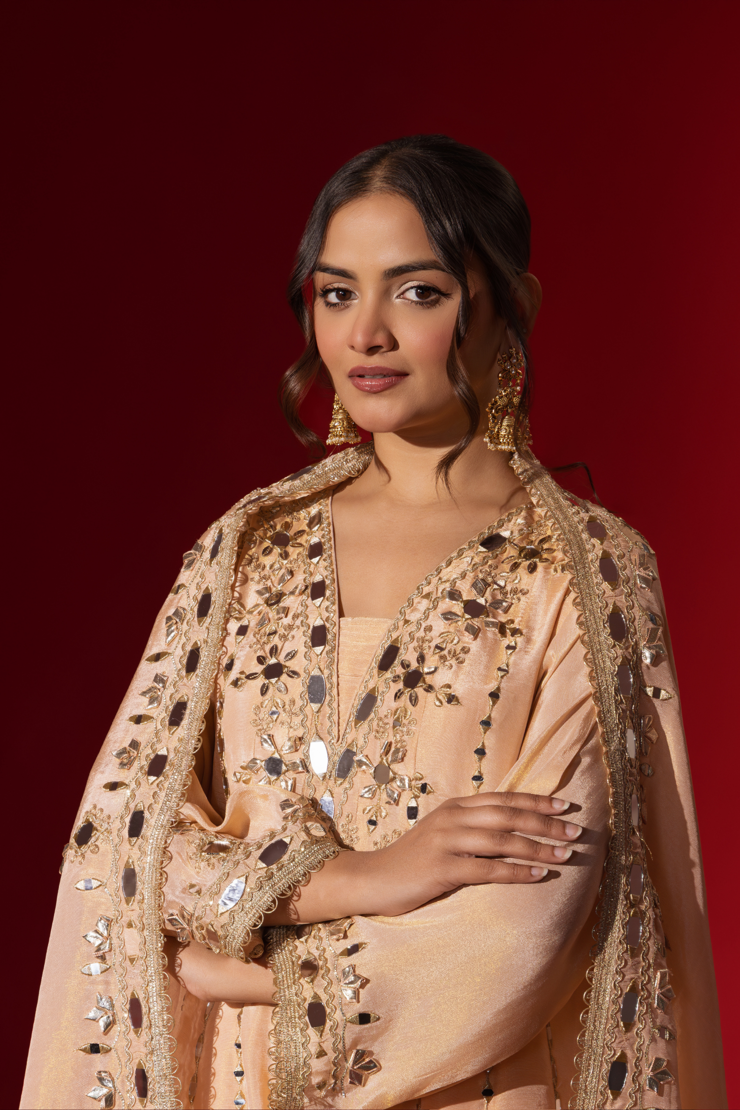 The set features a delicate and feminine kurta with rich gota and sheesha or mirror work. The intricate hand-embroidery on the yoke and throughout the garment showcases traditional Indian motifs, infused with modern sparkle. The full sleeves are also generously embellished, adding to the overall luxurious feel, perfect for a modern traditional look. It includes exquisitely embroidered palazzo trousers, designed for fluid movement.