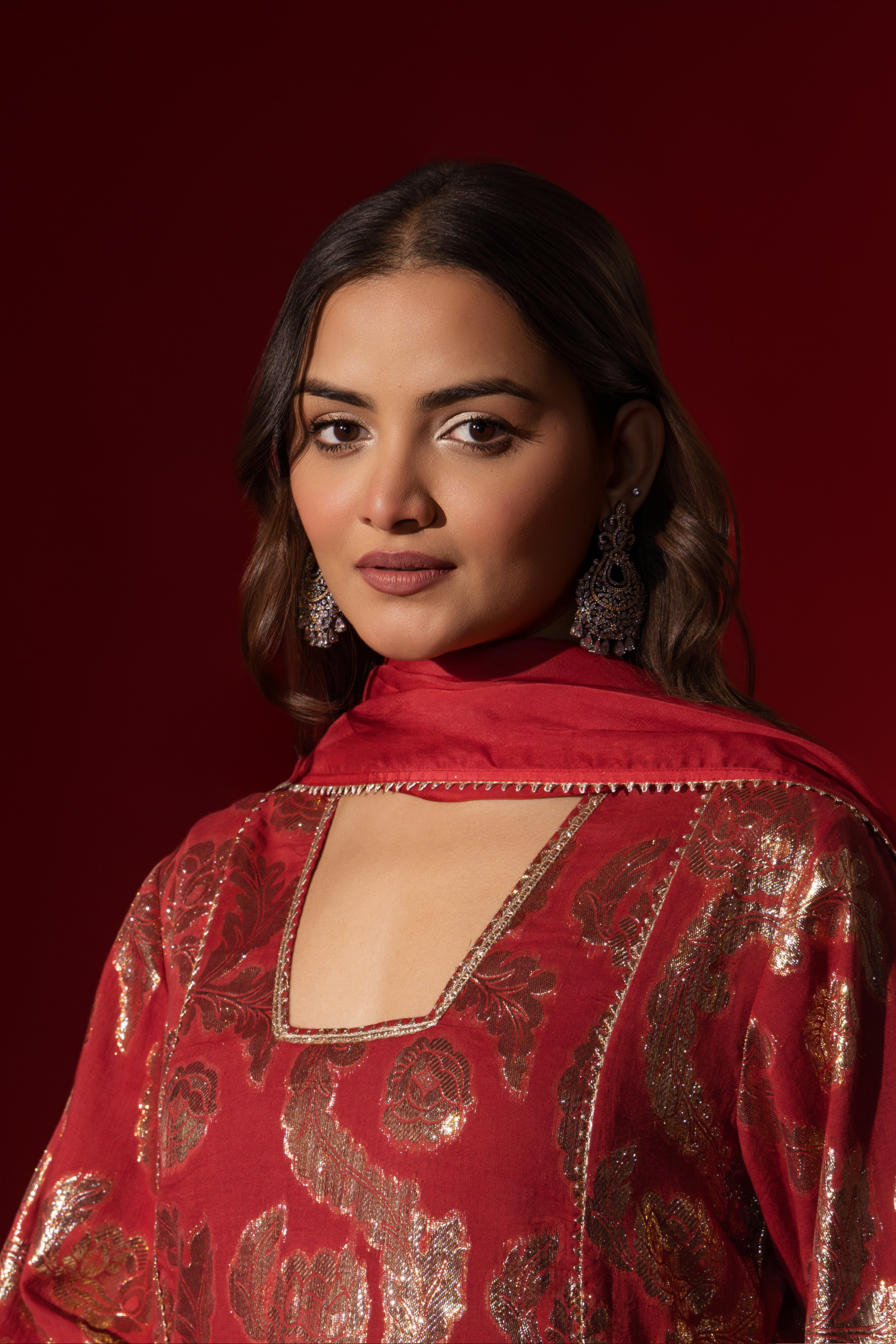 The Naseebo Maroon Grandeur Shimmer Kurta Set is a magnificent three-piece ensemble rooted in traditional opulence.