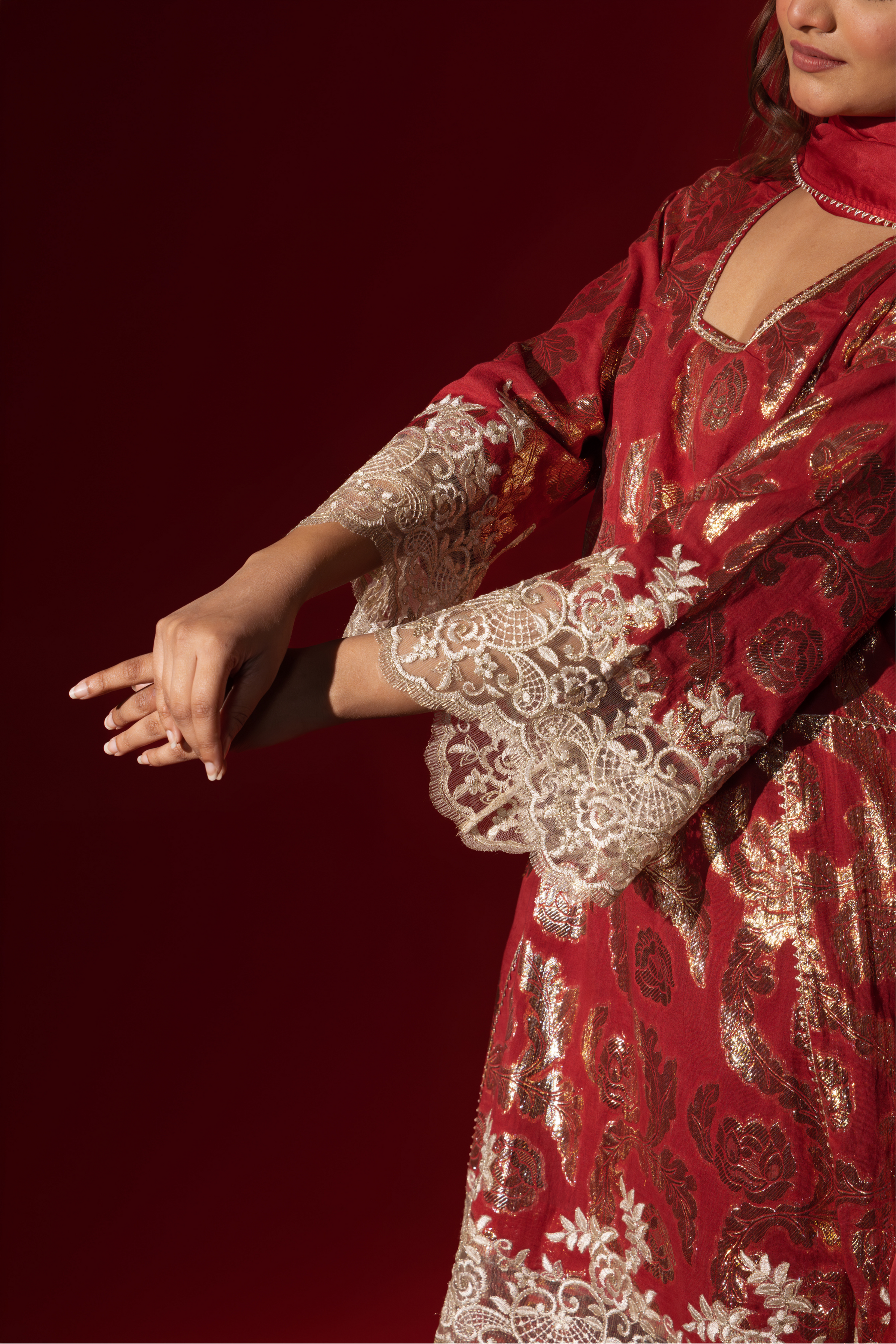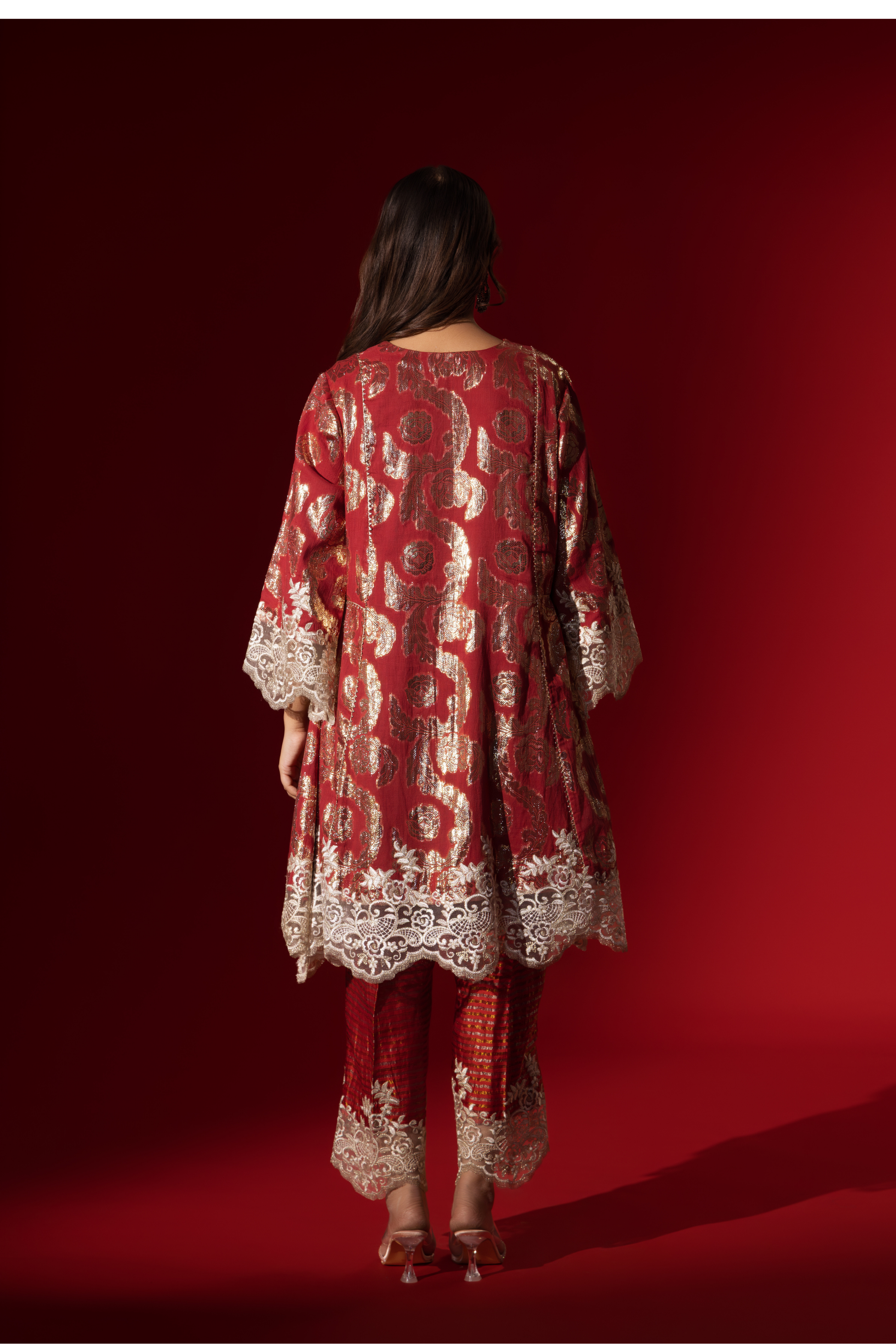 The rich Maroon hue, symbolic of Indian festivities, is beautifully complemented by the garment's inherent shimmer. The short, flared kurta silhouette offers a flattering and spirited fit, making it ideal for grand celebrations. The defining highlight is the wide scalloped lace border that finishes the hemline, adding an element of intricate femininity and structure. The matching trousers feature the same delicate lace paneling at the cuffs, and the sheer dupatta is finished with an exquisite scalloped lace edge.